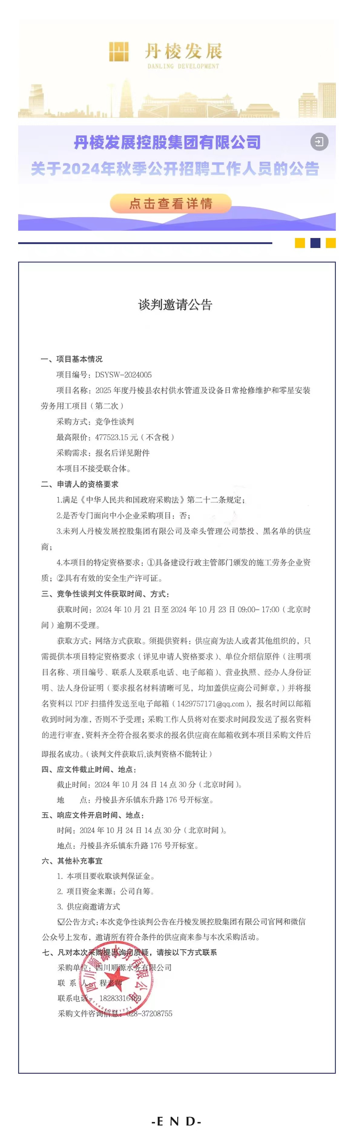 2025年度丹棱縣農村供水管道及設備日常搶修維護和零星安裝勞務用工項目第二次談判邀請公告