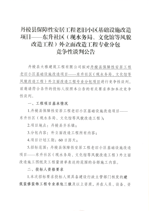 【大雅建筑公司】丹棱縣保障性安居工程老舊小區(qū)基礎(chǔ)設(shè)施改造項目--東升社區(qū)(現(xiàn)水務(wù)局、文化館等風貌改造工程)外立面改造工程專業(yè)分包競爭性談判公告