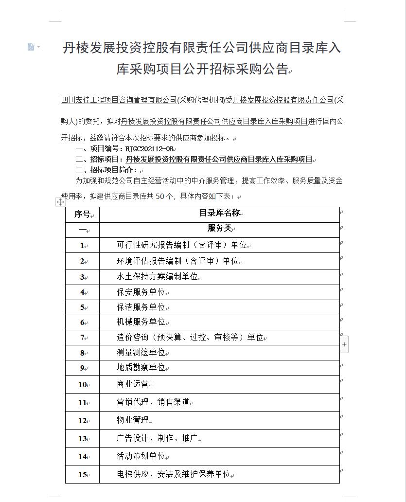 【丹發(fā)展公司】丹棱發(fā)展投資控股有限責(zé)任公司供應(yīng)商目錄庫入庫采購項(xiàng)目公開招標(biāo)采購公告