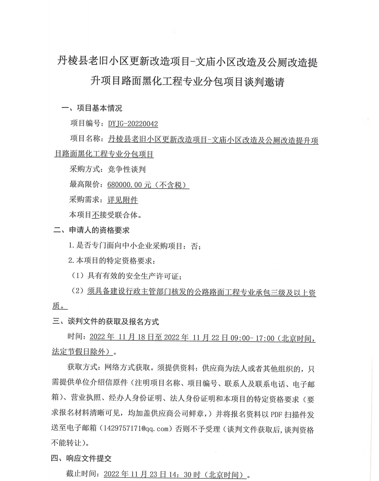 丹棱縣老舊小區(qū)更新改造項(xiàng)目-文廟小區(qū)改造及公廁改造提升項(xiàng)目路面黑化工程專業(yè)分包項(xiàng)目競(jìng)爭(zhēng)性談判邀請(qǐng)公告