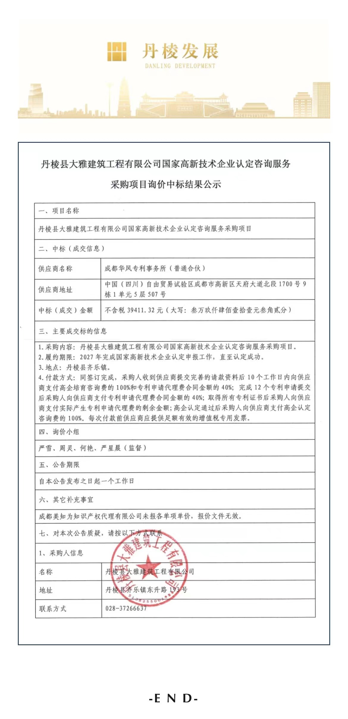丹棱縣大雅建筑工程有限公司國家高新技術(shù)企業(yè)認定咨詢服務(wù)采購項目詢價中標結(jié)果公示