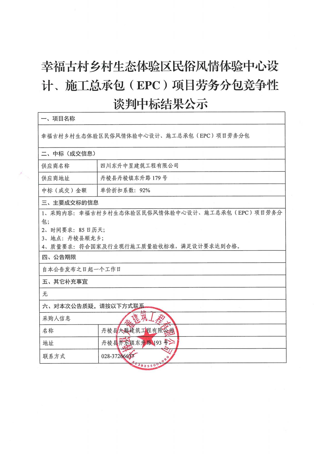 【大雅建筑公司】幸福古村鄉(xiāng)村生態(tài)體驗(yàn)區(qū)民俗風(fēng)情體驗(yàn)中心設(shè)計(jì)、施工總承包(EPC)項(xiàng)目勞務(wù)分包競爭性談判中標(biāo)結(jié)果公示