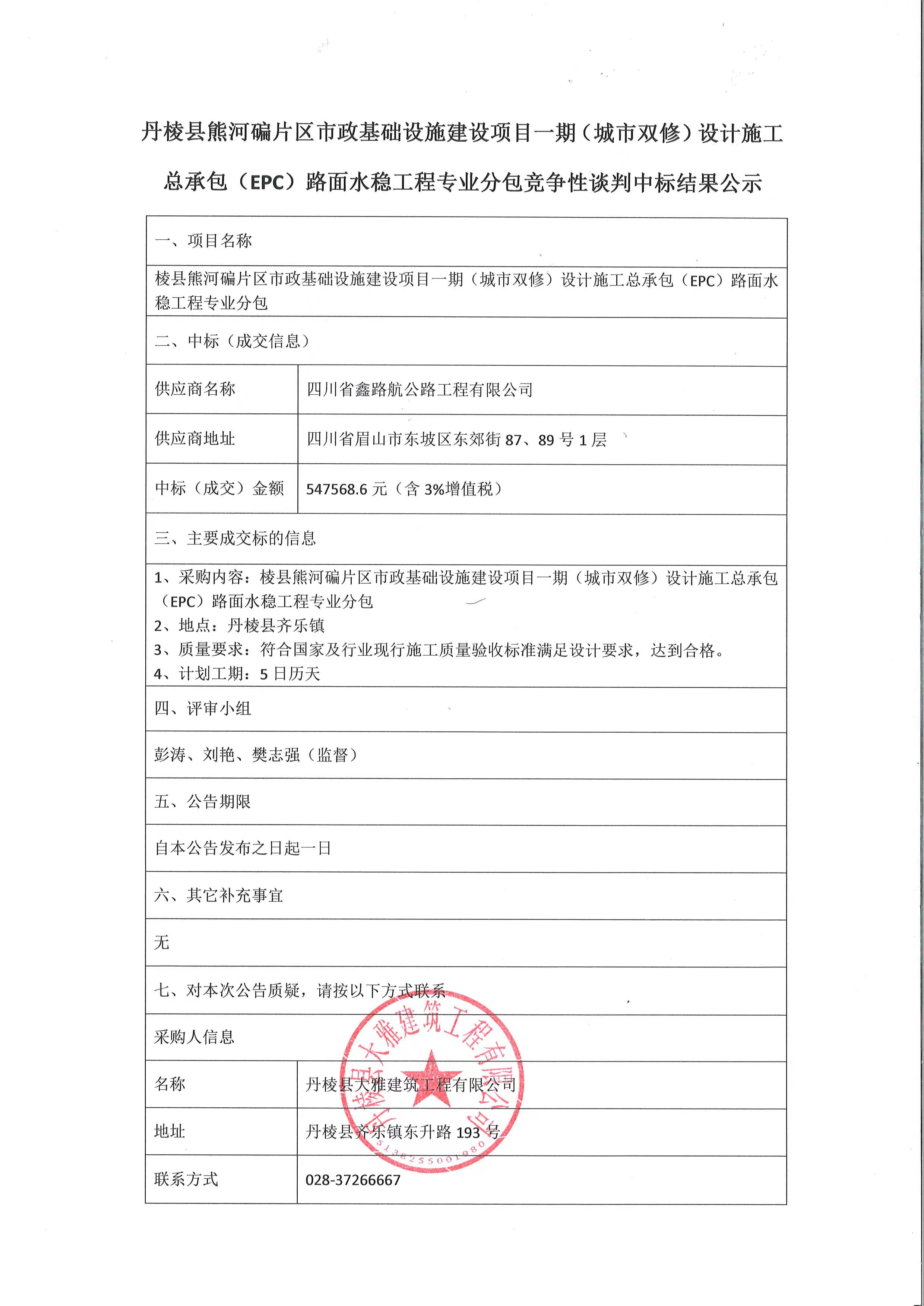 丹棱縣熊河碥片區(qū)市政基礎(chǔ)設(shè)施建設(shè)項(xiàng)目一期(城市雙修)設(shè)計(jì)施工總承包(EPC)路面水穩(wěn)工程專業(yè)分包競(jìng)爭(zhēng)性談判中標(biāo)結(jié)果公示