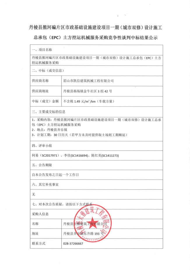 丹棱縣熊河碥片區(qū)市政基礎(chǔ)設(shè)施建設(shè)項目一期(城市雙修)設(shè)計施工 總承包(EPC)土方挖運機械服務(wù)采購競爭性談判中標結(jié)果公示