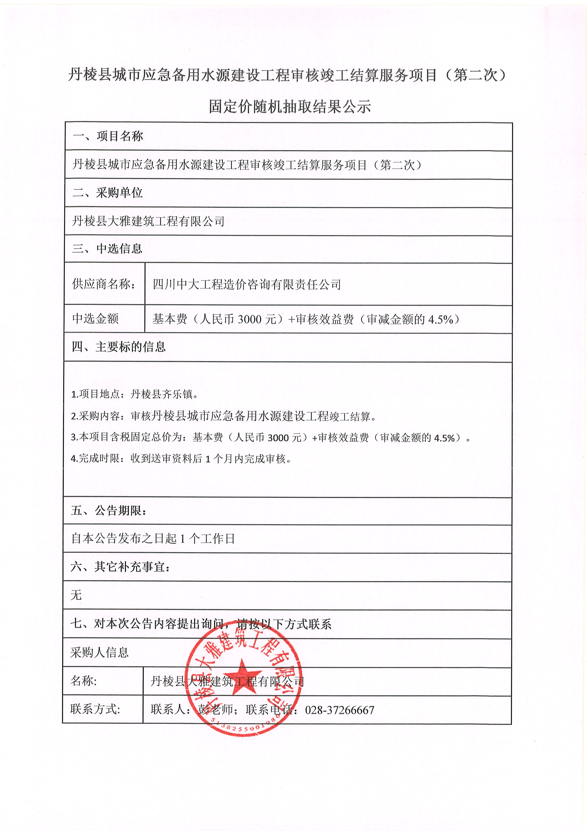 丹棱縣城市應急備用水源建設工程審核竣工結(jié)算服務項目(第二次) 固定價隨機抽取結(jié)果公示
