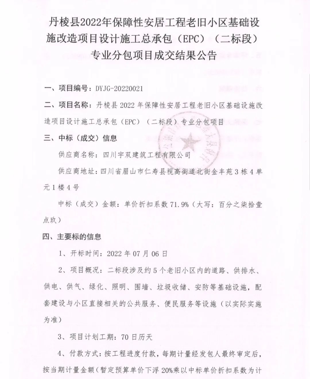 丹棱縣2022年保障性安居工程老舊小區(qū)基礎(chǔ)設(shè)施改造項(xiàng)目設(shè)計(jì)施工總承包(EPC)(二標(biāo)段)專業(yè)分包項(xiàng)目成交結(jié)果公告