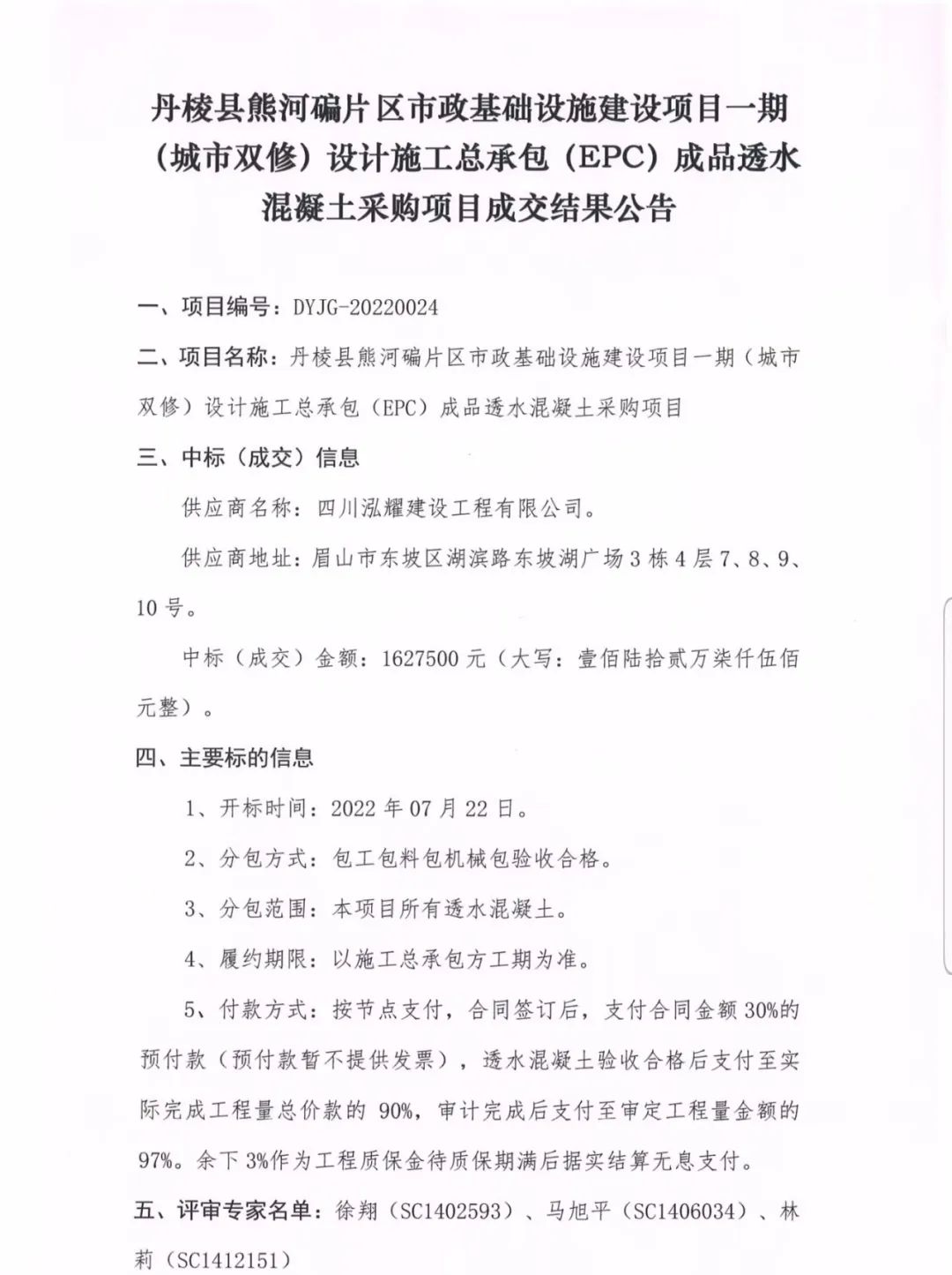 丹棱縣熊河碥片區(qū)市政基礎(chǔ)設(shè)施建設(shè)項目一期(城市雙修)設(shè)計施工總承包(EPC)成品透水混凝土采購項目成交結(jié)果公告