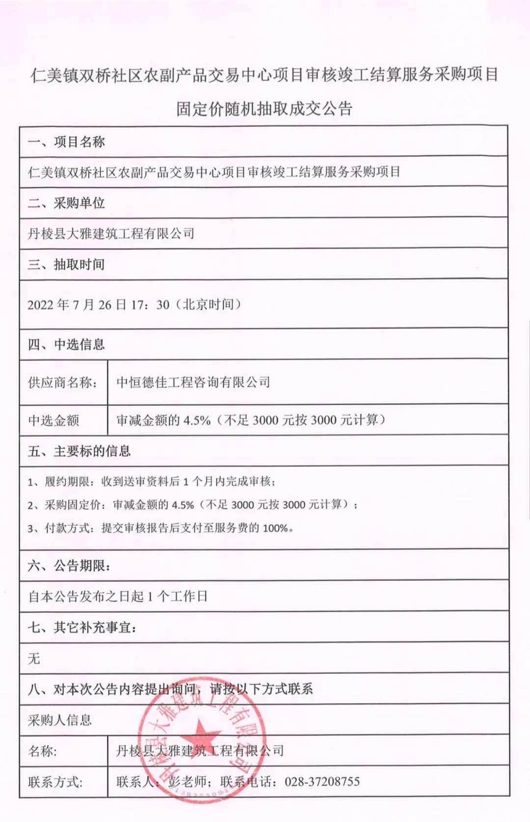 仁美鎮(zhèn)雙橋社區(qū)農(nóng)副產(chǎn)品交易中心項(xiàng)目審核竣工結(jié)算服務(wù)采購項(xiàng)目固定價隨機(jī)抽取成交公告