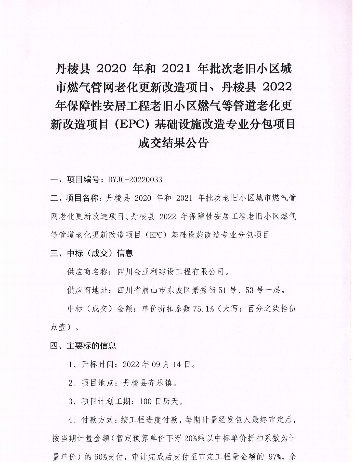 丹棱縣2020年和2021年批次老舊小區(qū)城市燃氣管網老化更新改造項目、丹棱縣2022年保障性安居工程老舊小區(qū)燃氣等管道老化更新改造項目(EPC)基礎設施改造專業(yè)分包項目 成交結果公告