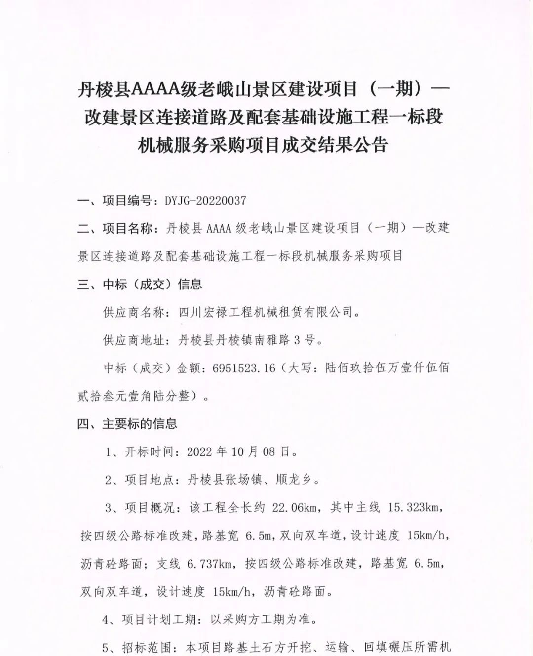 丹棱縣AAAA級(jí)老峨山景區(qū)建設(shè)項(xiàng)目(一期)--改建景區(qū)連接道路及配套基礎(chǔ)設(shè)施工程一標(biāo)段機(jī)械服務(wù)采購(gòu)項(xiàng)目成交結(jié)果公告