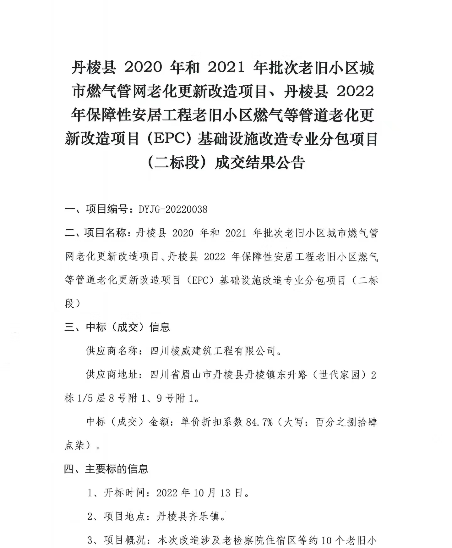 丹棱縣2020年、2021年和2022年老舊小區(qū)城市燃氣管網(wǎng)老化更新改造項目基礎設施改造專業(yè)分包項目(二標段)成交結(jié)果公告
