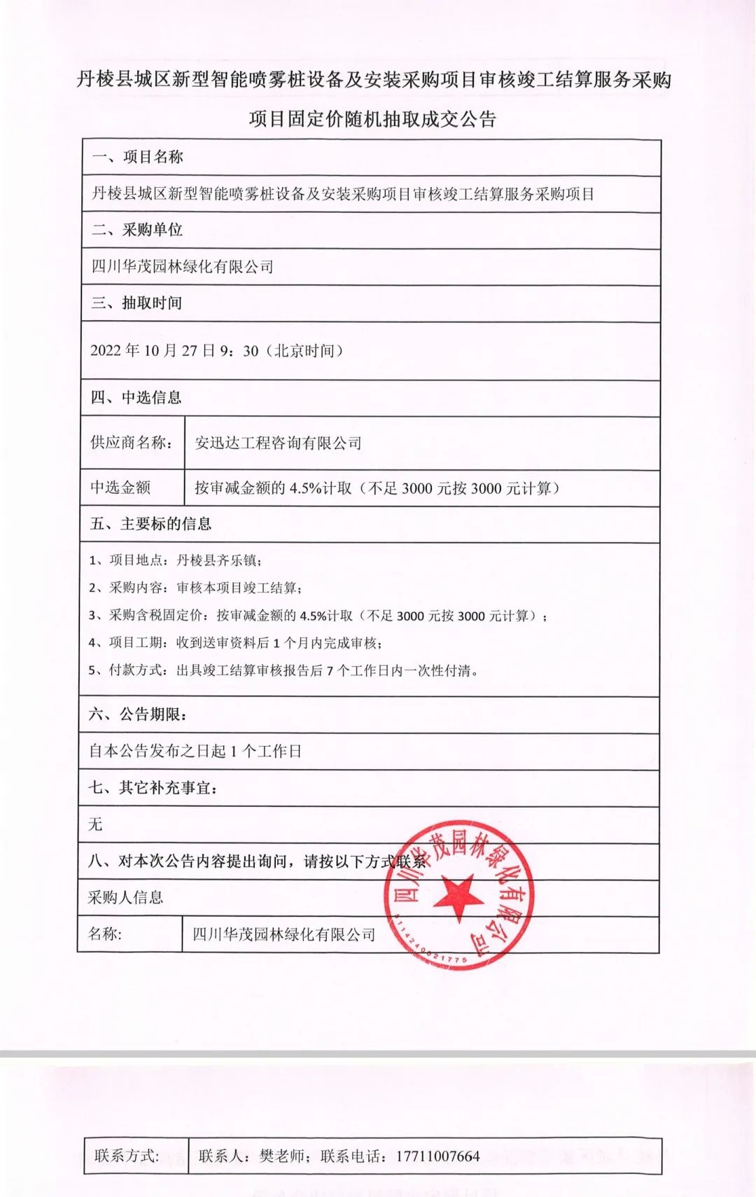 丹棱縣城區(qū)新型智能噴霧樁設備及安裝采購項目審核竣工結算服務采購項目固定價隨機抽取成交公告