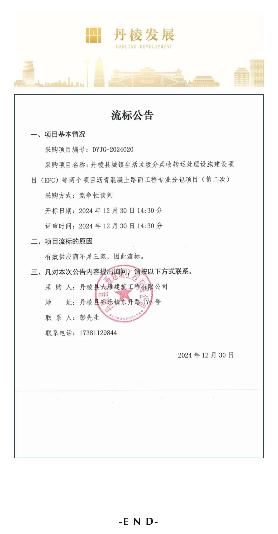 丹棱縣城鎮(zhèn)生活垃圾分類收轉(zhuǎn)運處理設(shè)施建設(shè)項目(EPC)等兩個項目瀝青混凝土路面工程專業(yè)分包項目(第二次)流標(biāo)公告