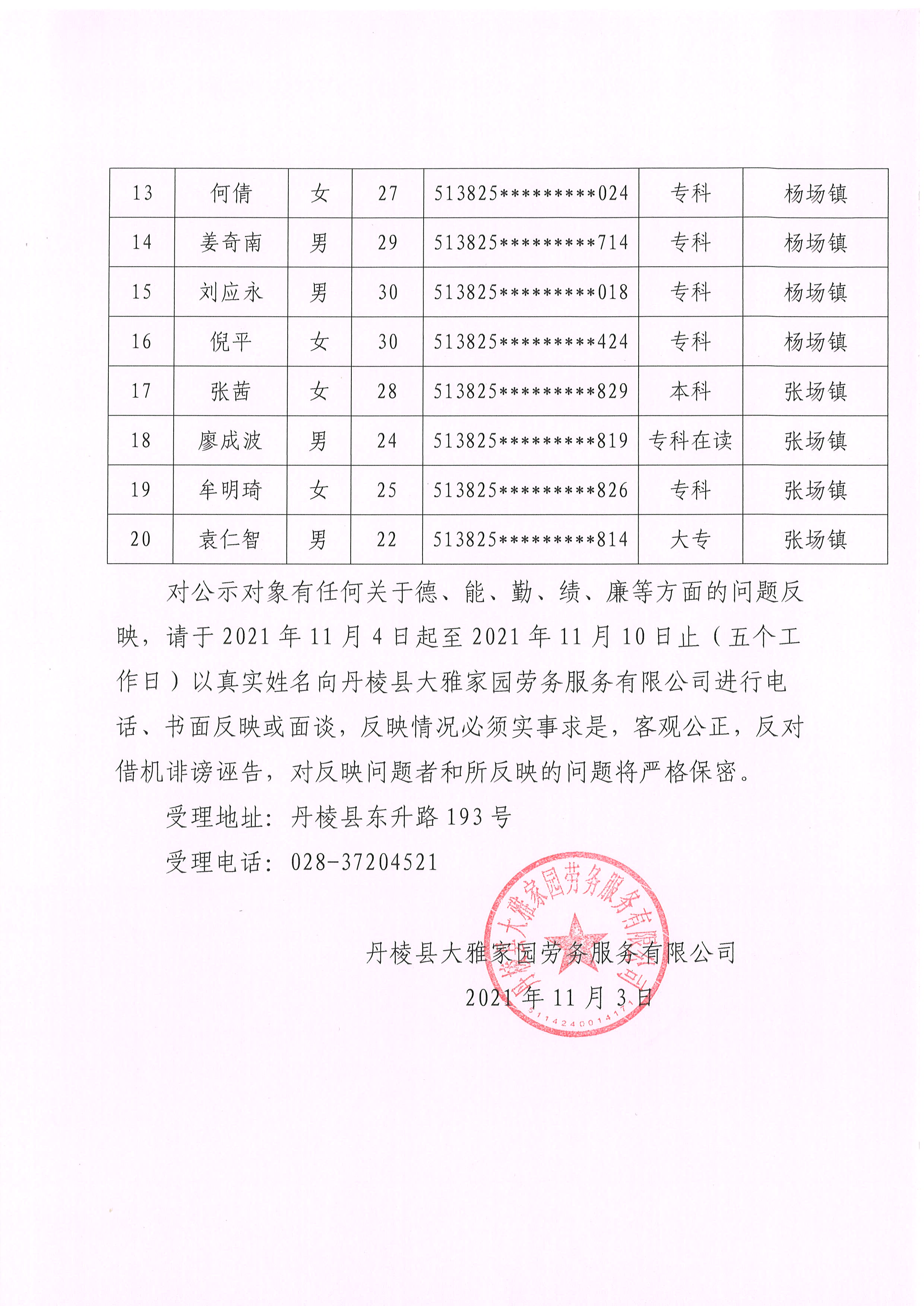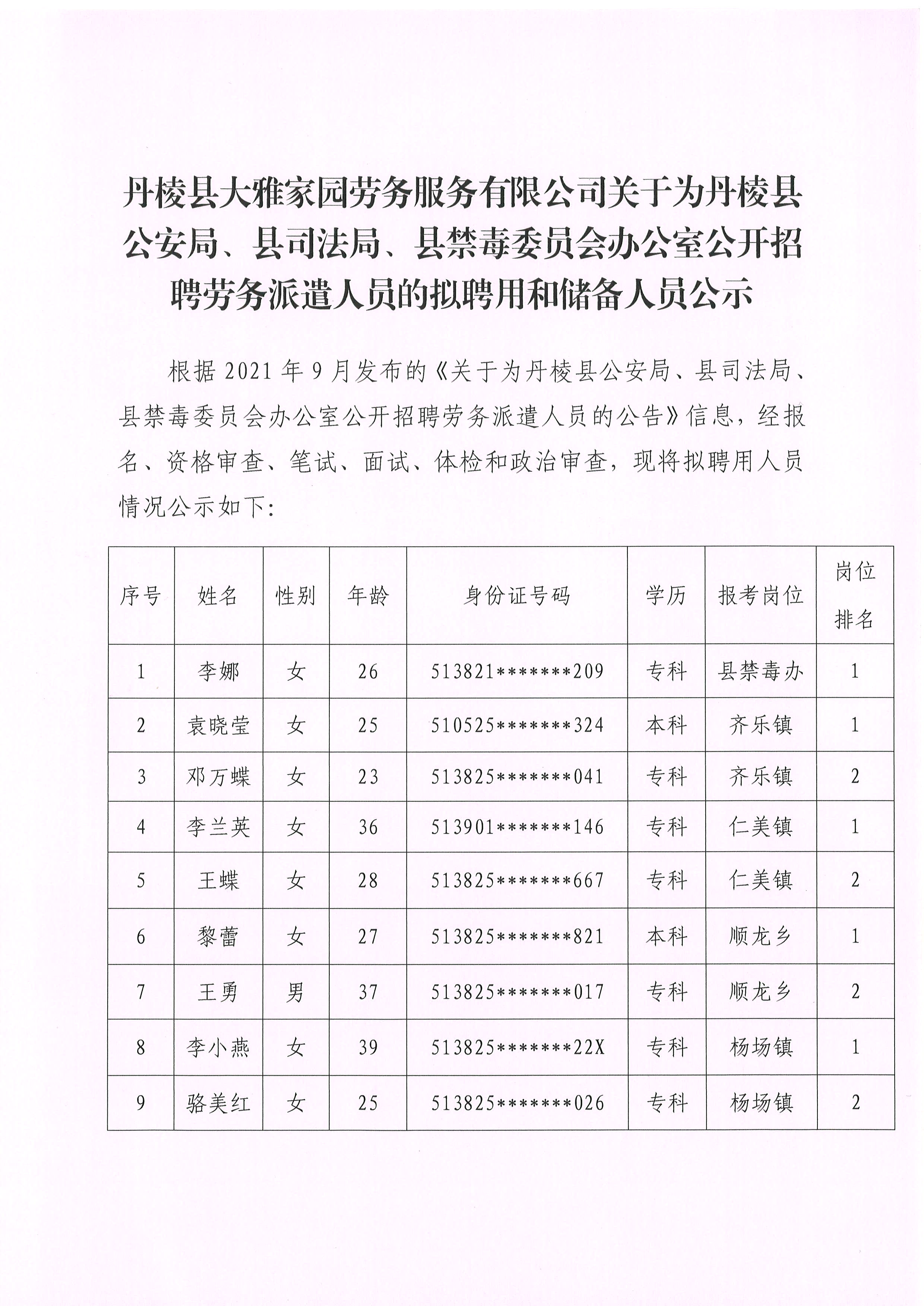 【大雅勞務(wù)公司】丹棱縣大雅家園勞務(wù)服務(wù)有限公司關(guān)于為丹棱縣公安局、縣司法局、縣禁毒委員會(huì)辦公室公開招聘勞務(wù)派遣人員的擬聘用和儲(chǔ)備人員公示