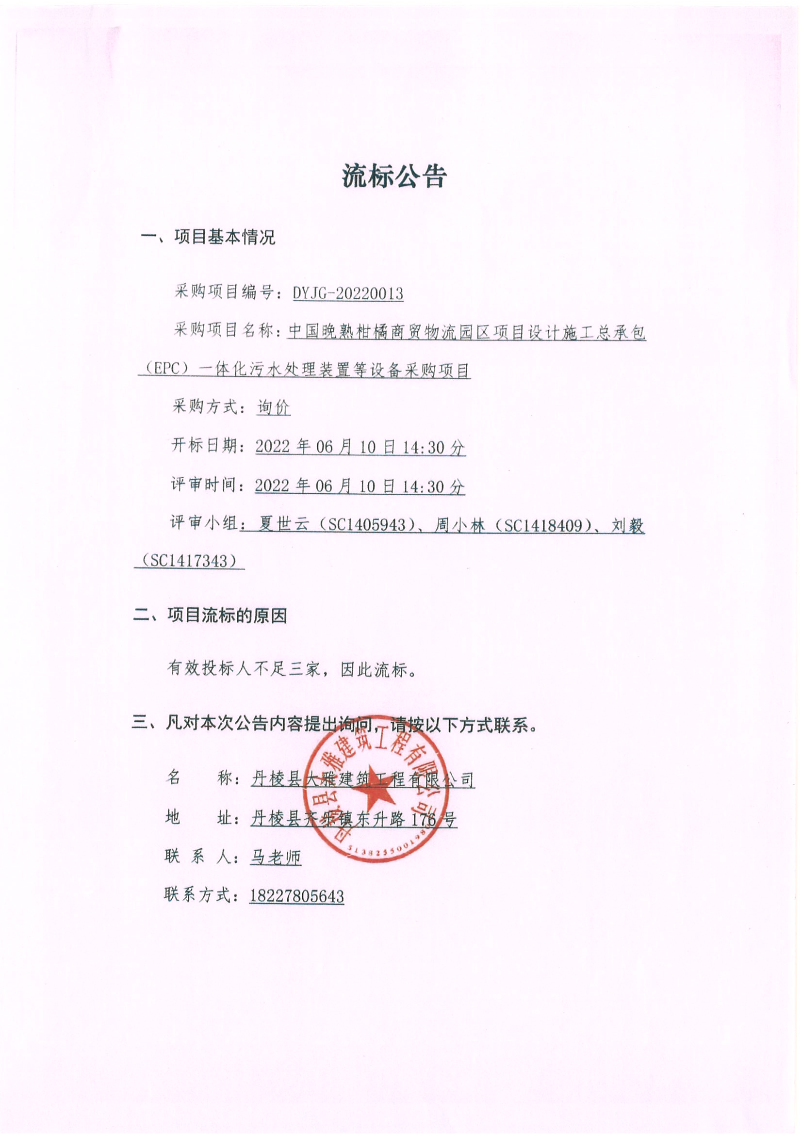 中國晚熟柑橘商貿(mào)物流園區(qū)項目設(shè)計施工總承包(EPC)一體化污水處理裝置等設(shè)備采購項目流標公告