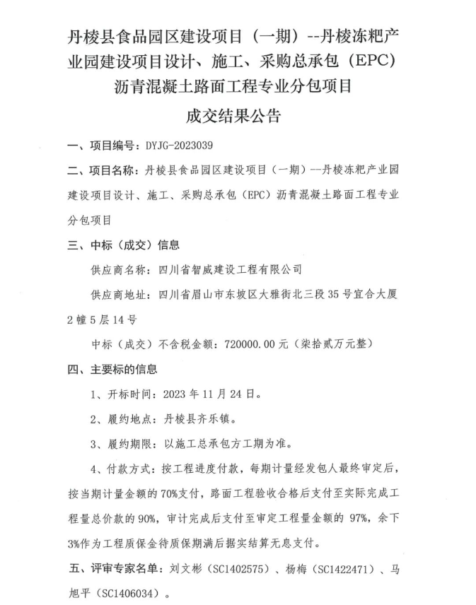丹棱縣食品園區(qū)建設(shè)項(xiàng)目(一期)—丹棱凍粑產(chǎn)業(yè)園建設(shè)項(xiàng)目設(shè)計(jì)、施工、采購(gòu)總承包(EPC)瀝青混凝土路面工程專(zhuān)業(yè)分包項(xiàng)目成交結(jié)果公告