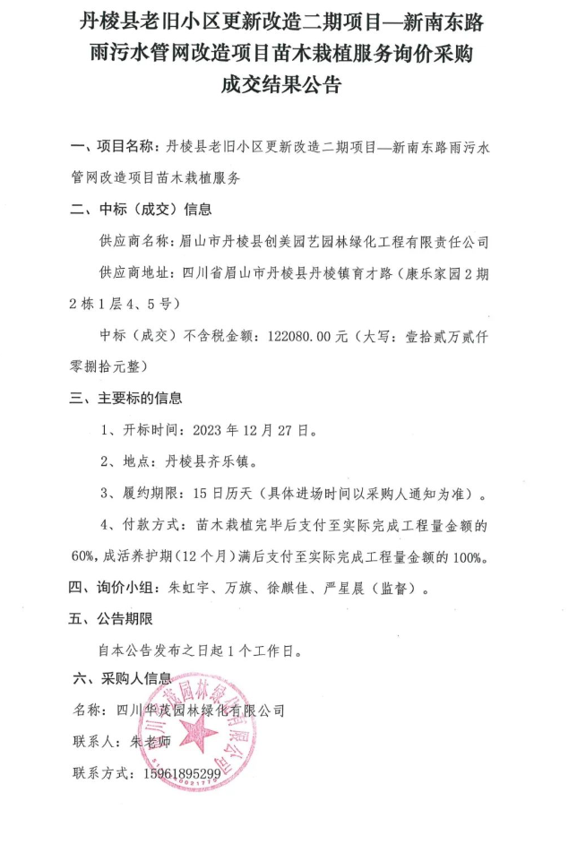 丹棱縣老舊小區(qū)更新改造二期項(xiàng)目——新南東路雨污水管網(wǎng)改造項(xiàng)目苗木栽植服務(wù)詢價采購成交結(jié)果公告