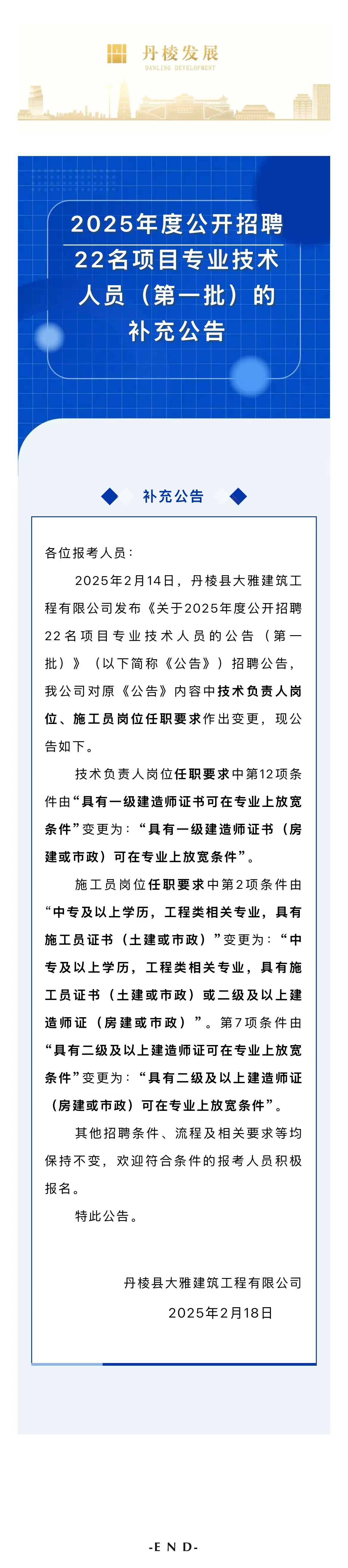 丹棱縣大雅建筑工程有限公司關(guān)于2025年度公開(kāi)招聘22名項(xiàng)目專(zhuān)業(yè)技術(shù)人員(第一批)的補(bǔ)充公告