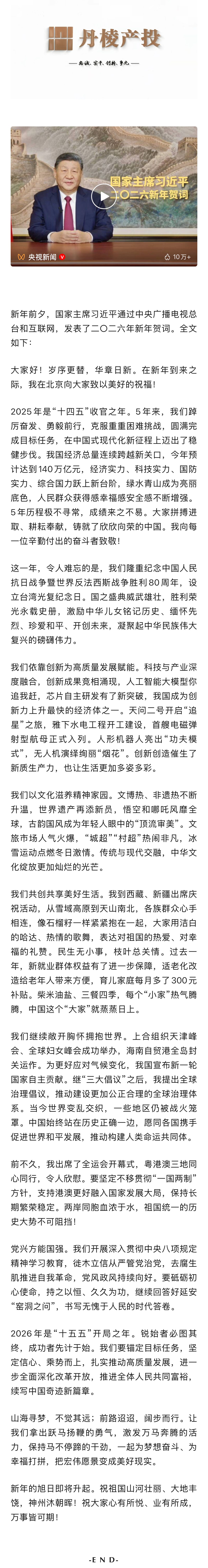 獨家視頻 | 國家主席習近平發(fā)表二〇二六年新年賀詞